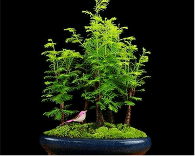 产于我国、为古代孑遗植物和活化石,属国家重点保护植物之一,现各省广为栽培。落叶乔木。树干笔直,树根部隆起膨大,树皮灰褐色,枝条不规则轮生,叶扁平柔软、线形、羽状交互对生、嫩绿色。花期3月,10月结球果。喜光,不耐阴,但耐寒,怕旱,在排水良好的河滩、湖边沉积土生长壮旺。繁殖有种子和扦插。春天,自掘或购回的树坯,在种植前将根系全部浸人水中数小时,然后上盆栽种,成活率高。新坯初种,一定要保持盆泥湿润,勿受干旱,否则难以成活。水杉萌发力强,新芽枝条多为向上,要想得到理想的层托,必须仔细选芽,待枝条老化后适当牵拉,方可达到造型要求。水杉耐肥不耐瘠,在适当时候每隔15天施肥一次,促其生长茂盛。水杉树姿古朴,叶色优美多变,是很受欢迎的制作岭南盆景、观赏和美化环境树种。